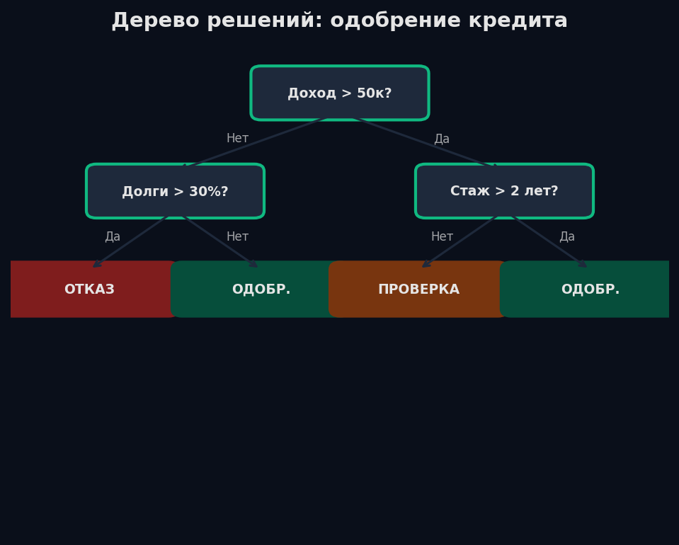 Линейные модели проводят одну границу (прямую/плоскость). А что если граница сложная? Дерево решений разбивает пространство признаков на прямоугольные области, задавая последовательность вопросов: «Доход > 50K? → Возраст > 30? → Одобрить кредит».