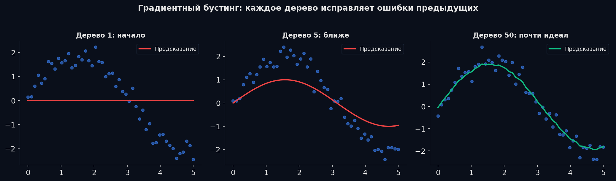 Random Forest строит деревья параллельно и независимо. Градиентный бустинг — принципиально другой подход: каждое новое дерево учится на ошибках предыдущих.