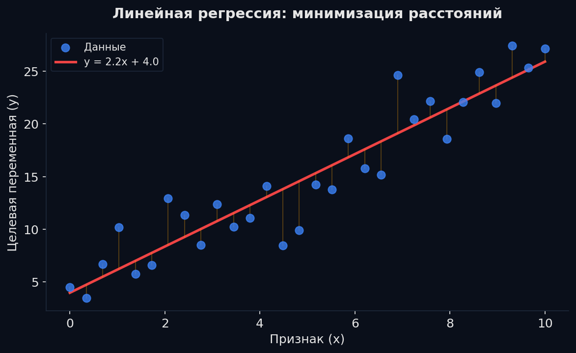 Аналогия: ты оцениваешь стоимость квартиры «на глазок». Каждый квадратный метр добавляет ~X рублей, каждый этаж — ещё Y, близость к метро — ещё Z. Линейная регрессия делает то же самое, но находит оптимальные X, Y, Z по данным.