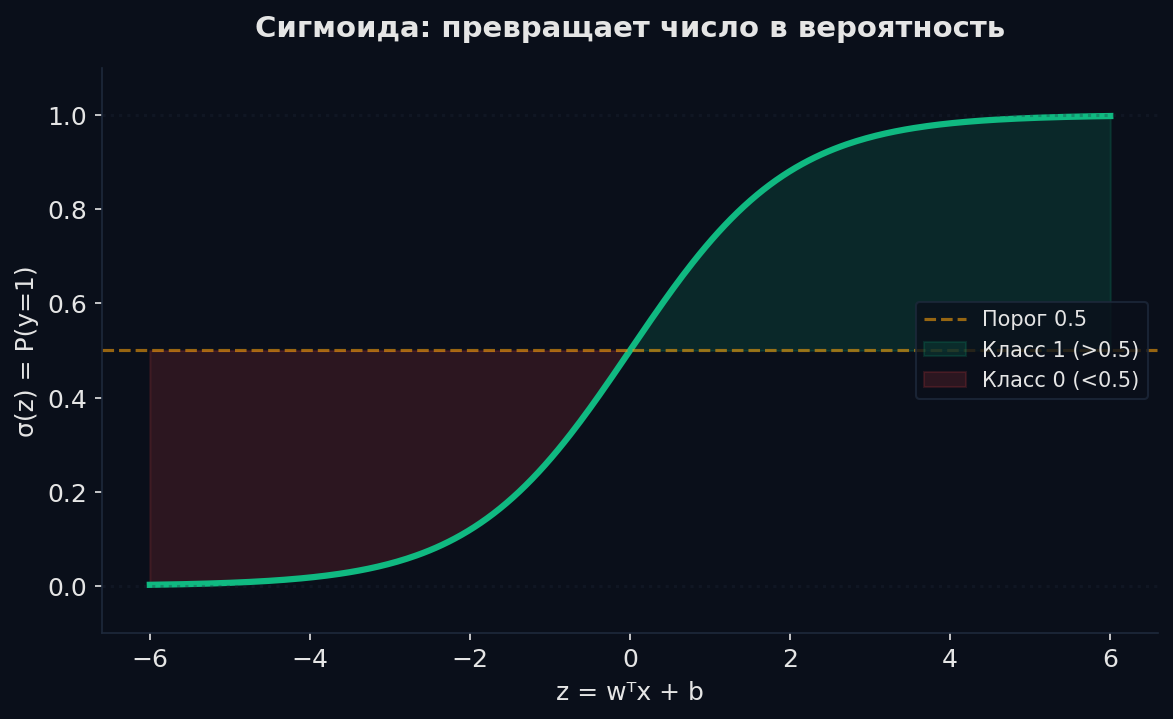 Идея: берём линейную комбинацию признаков (как в линейной регрессии), но пропускаем результат через сигмоиду — функцию, которая «сжимает» любое число в диапазон от 0 до 1. Получаем вероятность принадлежности к классу 1.