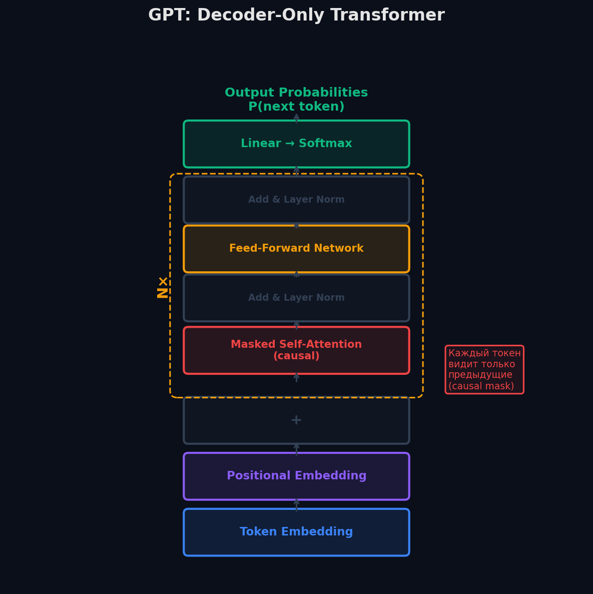 Задача GPT — генерация. При генерации нет «исходного предложения», которое нужно понять (как при переводе) — есть только текст, который нужно продолжить. Энкодер здесь просто не нужен. А decoder-only архитектура элегантно унифицирует обучение и генерацию: и при train, и при inference модель делает одно и то же — читает токены слева направо и предсказывает следующий.