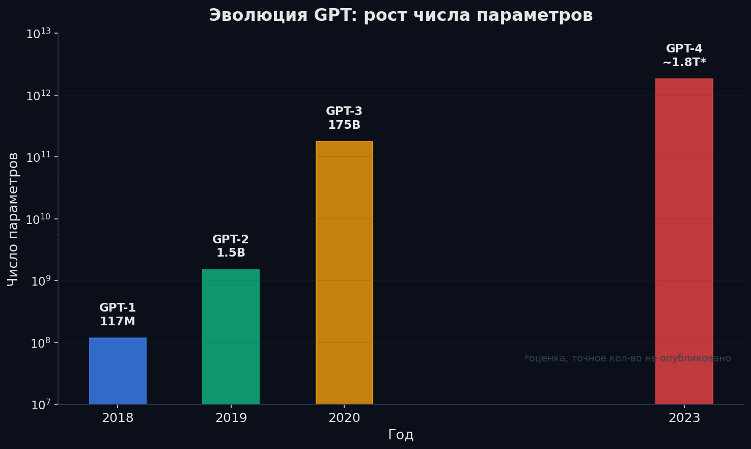История GPT — идеальная иллюстрация scaling laws. Архитектура почти не менялась — росли масштабы и возможности.