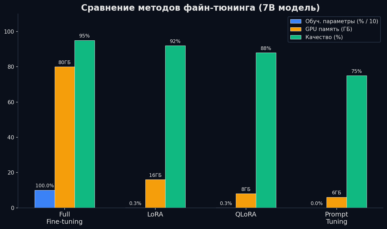 Fine-tuning — это дообучение модели на твоих данных. После него модель «из коробки» отвечает в нужном стиле, знает доменную терминологию и следует инструкциям без километровых промптов. Проблема в том, что полное дообучение 7B-модели требует 60+ ГБ видеопамяти и кластер GPU. Но за последние два года появились методы, которые позволяют делать fine-tuning на одной потребительской видеокарте — и это изменило всё.
