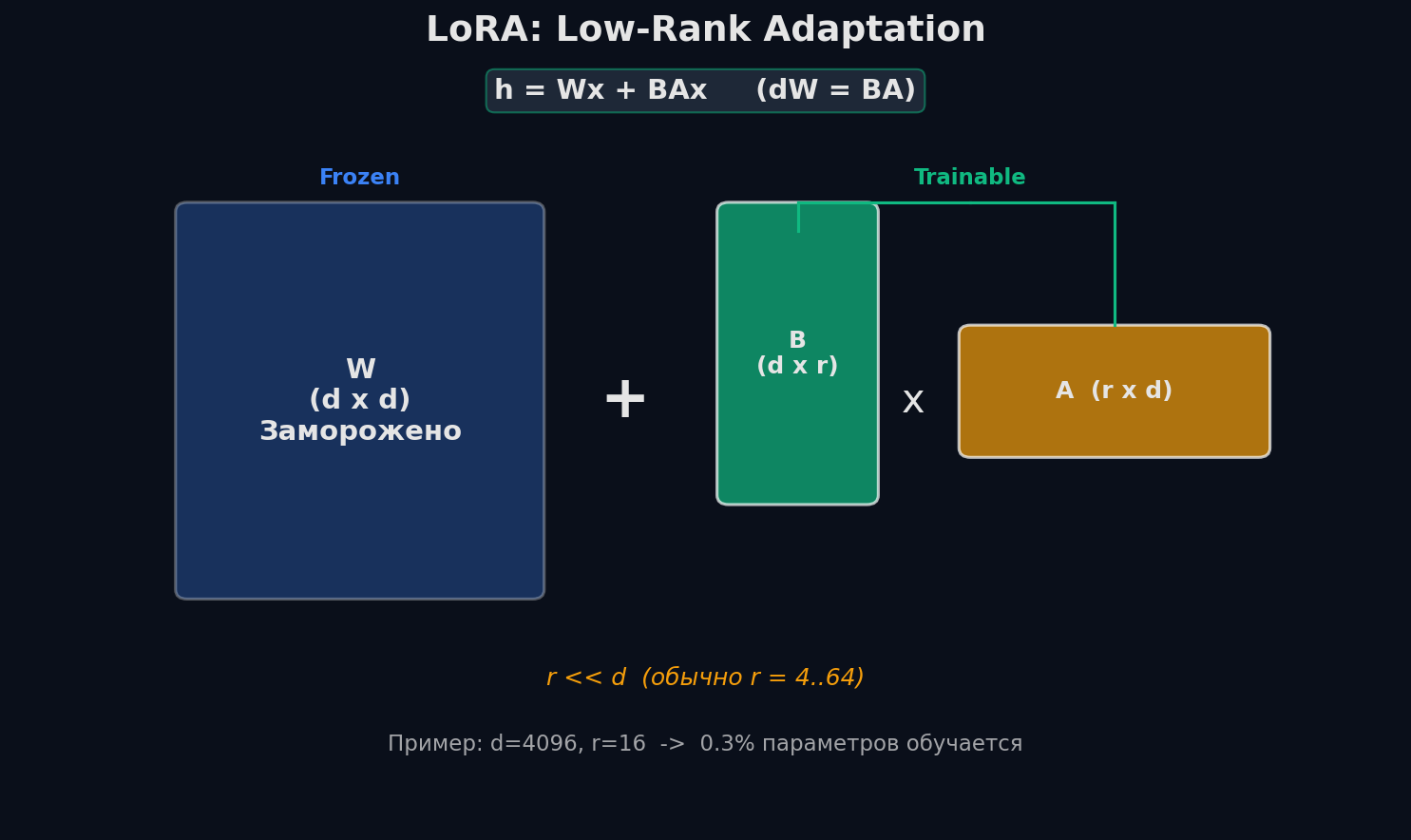 W — оригинальные веса (заморожены), B и A — обучаемые матрицы. Произведение BA имеет ранг ≤ r, что и даёт экономию