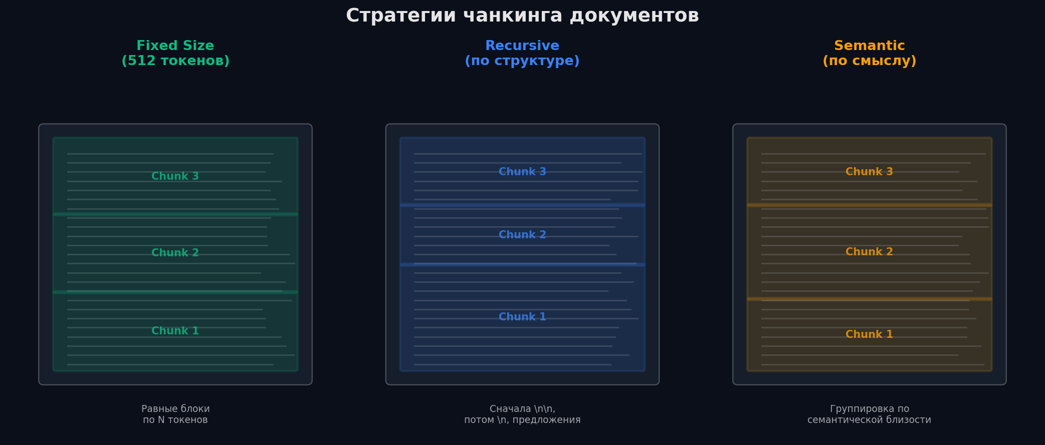 По структуре документа — для документов с чёткой структурой (HTML, Markdown, юридические контракты). Разбиваем по заголовкам, таблицам, спискам. Требует знания формата, но даёт отличные результаты.