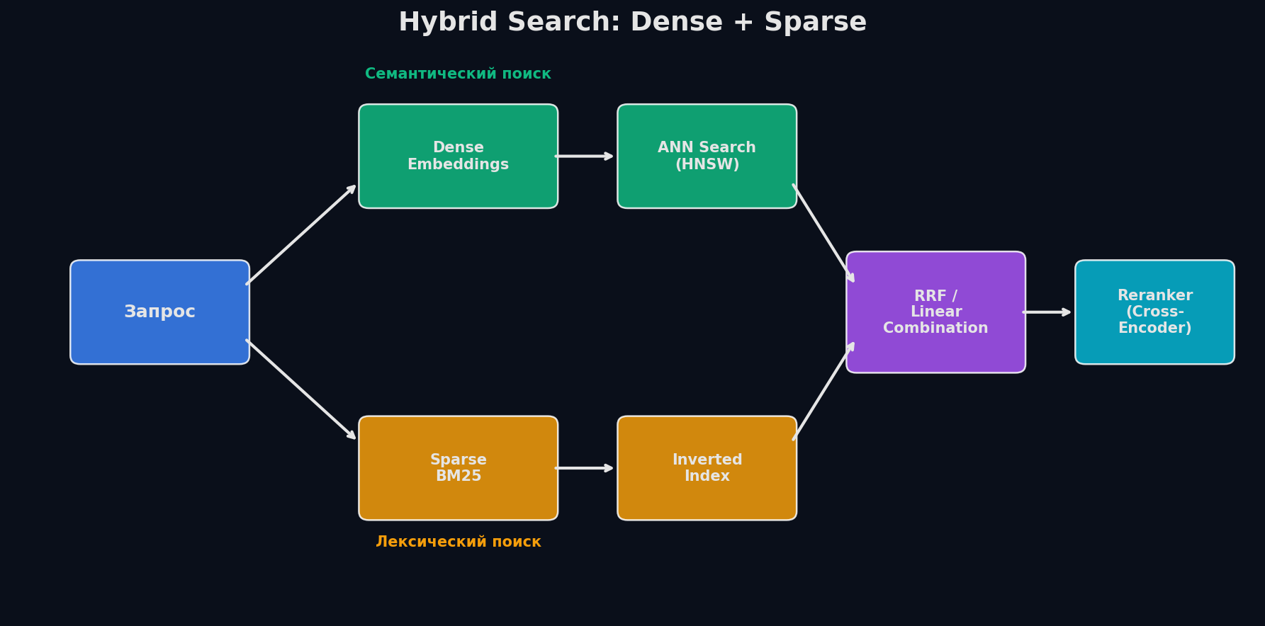 Hybrid search — комбинирует dense и sparse. Каждый метод возвращает свой ранжированный список, затем списки объединяются. Стандартный способ объединения — Reciprocal Rank Fusion (RRF):