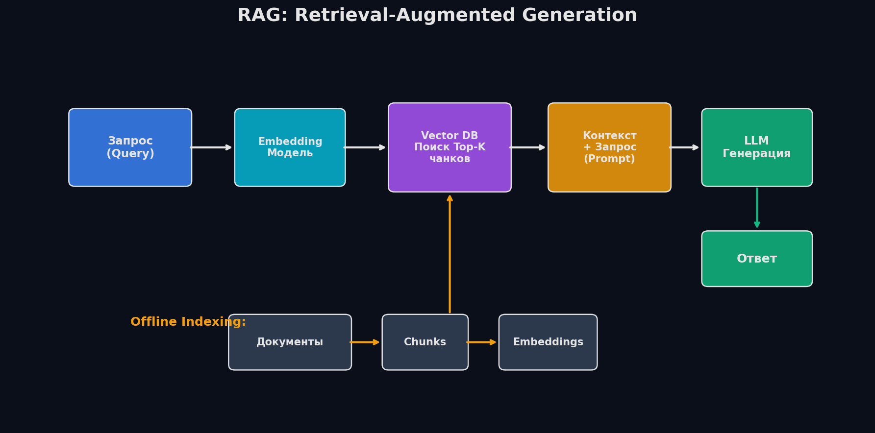 4. Vector Store — векторы записываются в хранилище, оптимизированное для быстрого поиска ближайших соседей. Варианты: FAISS (in-memory, быстрый), Chroma (простой, для прототипов), Pinecone/Weaviate/Qdrant (managed, для прода).