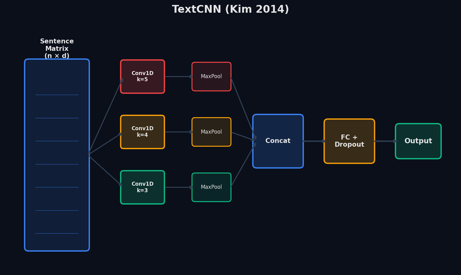 Yoon Kim, 2014. Идея простая: слова → матрица эмбеддингов (каждая строка — вектор слова). По этой матрице едут свёрточные фильтры разных размеров (3, 4, 5 слов) — по сути, детекторы n-грамм. Потом max pooling — из каждого фильтра берём самое сильное срабатывание. Получается вектор фиксированной длины → полносвязный слой → класс.