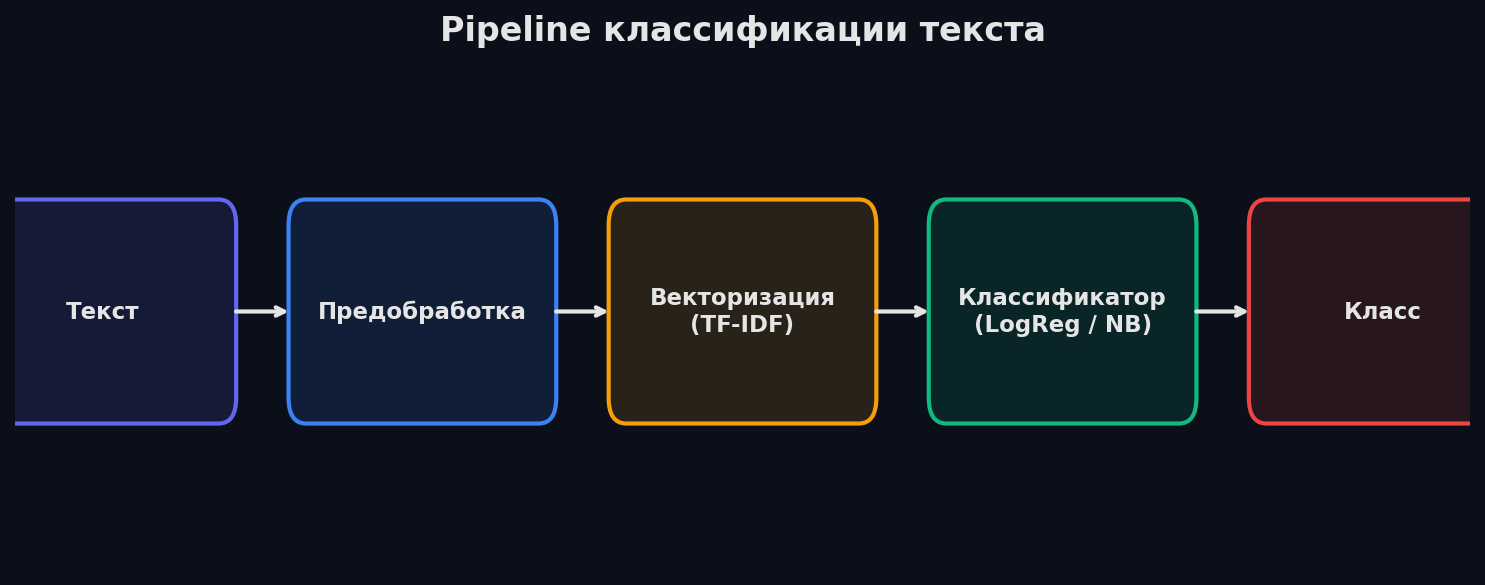 Определить тональность отзыва, отфильтровать спам, раскидать тикеты по категориям — всё это классификация текстов. Задача старая, решения проверенные. Хорошая новость: для 80% продакшн-задач хватает TF-IDF + LogReg. Плохая новость: на собесе спросят и про нейросетевые подходы.