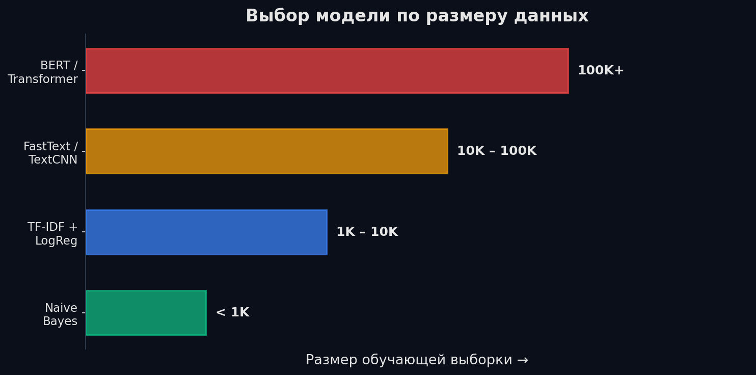 Выбор зависит от объёма данных и требований. Общее правило: начни с простого, усложняй по необходимости. Если TF-IDF + LogReg даёт F1 0.92 — не нужен BERT.
