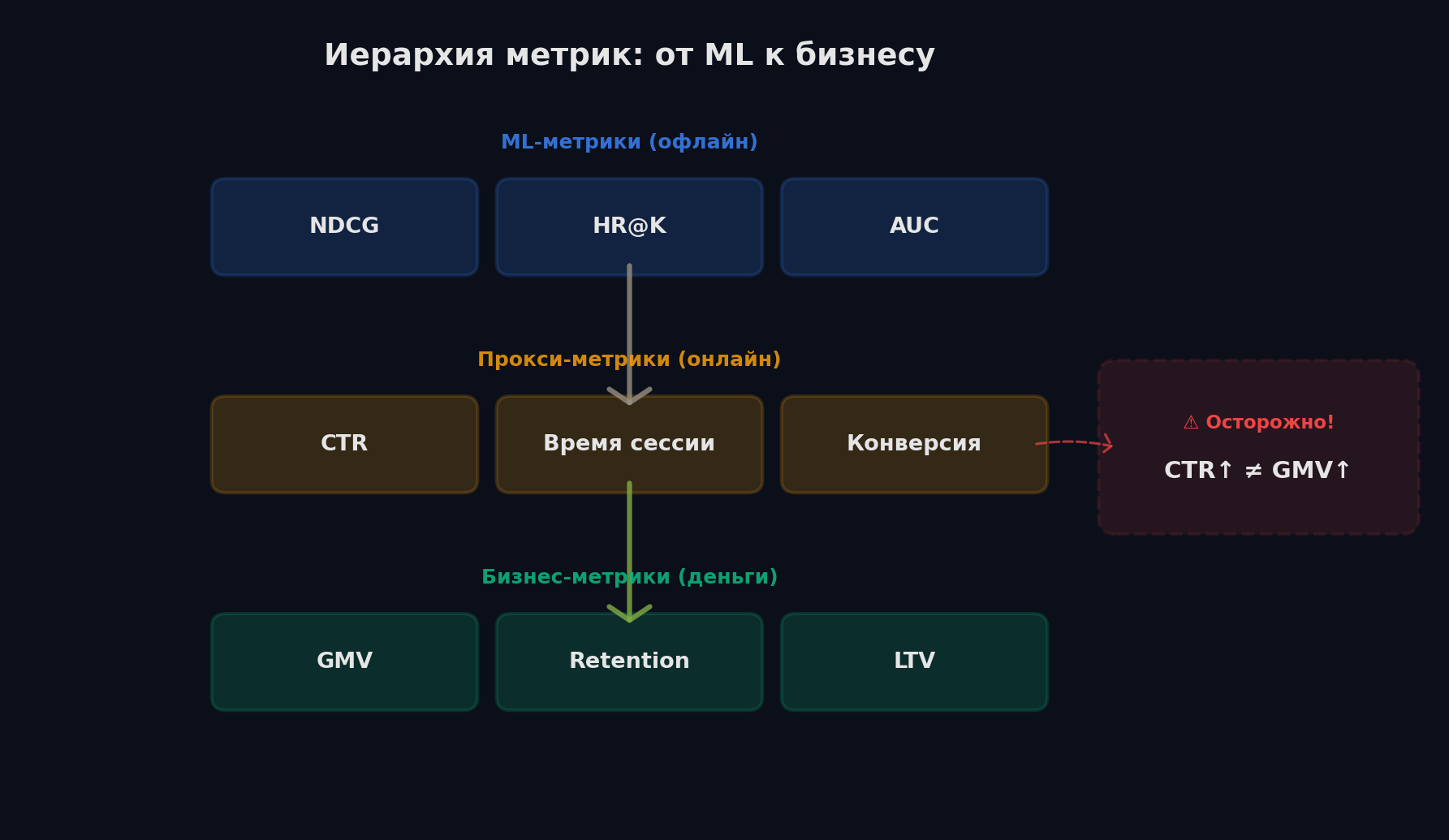 Конкретный пример разрыва: ты оптимизировал модель на NDCG (уровень 1). CTR вырос на 3% (уровень 2) — ура! Но конверсия упала на 1% (уровень 3). Что произошло? Модель научилась ставить наверх «кликабельные» товары (яркие картинки, скидки), но пользователи кликали и уходили — не покупали. Прокси-метрика выросла, бизнес-метрика упала.